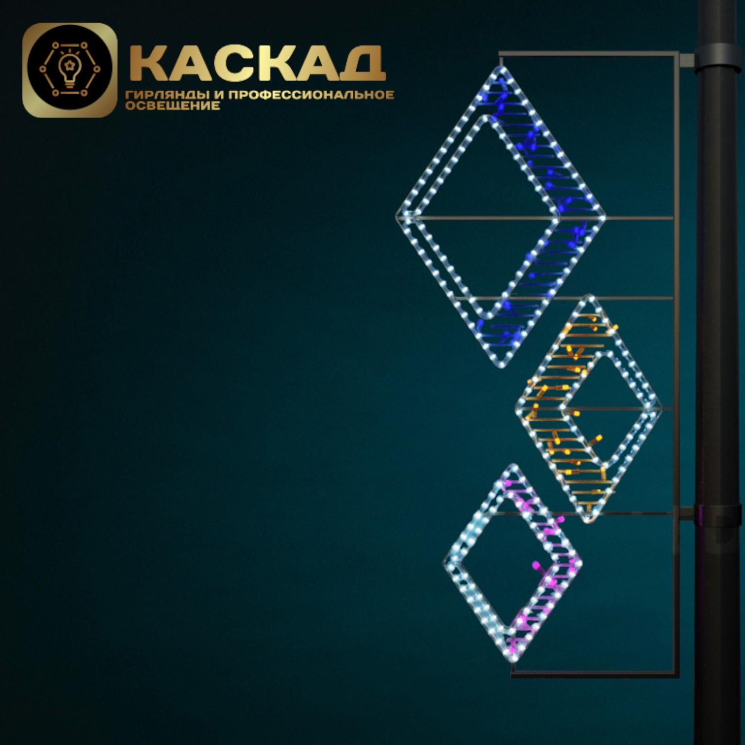Панель-кронштейн "Ромбы": Высота: 149 см Ширина: 68 см Влагозащищенность: IP65 Каркас: Металлический Материал: Дюралайт, Нить Напряжение: 220 В Потребляемая мощность: 32 Вт Цвета: Синий - желтый - розовый Белый -синий Желтый - красный Теплый белый - белый Желтый - теплый белый